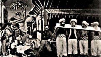 In a public place in Constantinople at the corner of a bazaar, the executioner is seated upon a stone and is resting from his daily labors while eating a crust of bread. Suddenly there come running into the place a lot of Turkish men and women preceding some Turkish policemen, who drag along four prisoners in chains. The policemen shut up the four prisoners in the pillory. Their four heads stick up through the huge plank, which is provided with four openings. One of the policemen urges the executioner to decapitate the prisoners. He accordingly seizes a mighty sabre and cuts off by a single stroke the four heads, which roll upon the ground.