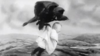 A woodsman leaves a hut followed by a woman with their baby. Nearby some men chop down a tree. The baby is left outside the hut, but an eagle flies away with it.