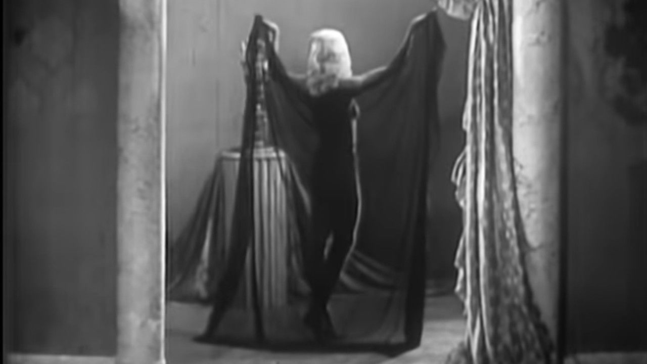 A burlesque presentation in an antique environment with Faith Bacon in black veils.